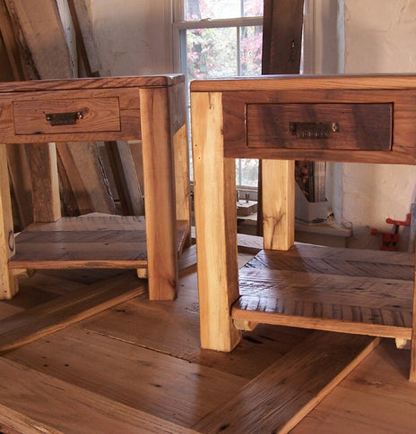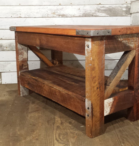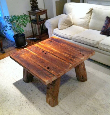 A lovely blend of artisan design and reclaimed antique wood, our sturdy coffee tables feature hand peeled pine logs salvaged from the roof members of an old log cabin originally part of a freed slave settlement built just after the Civil War. From your cabin, ski lodge, country farm or downtown loft, they look great in any setting! Shown here with the rich russets and browns of the natural aged patina finished with a low gloss wood oil finish.