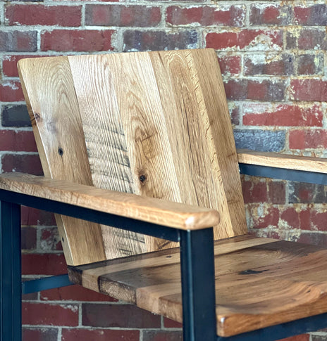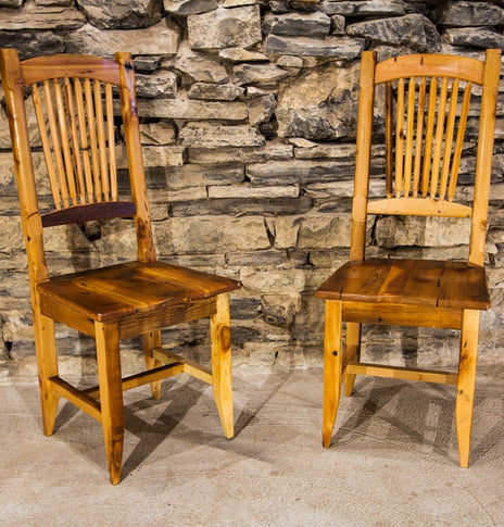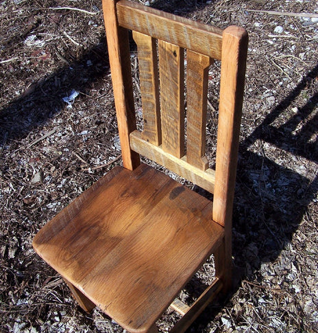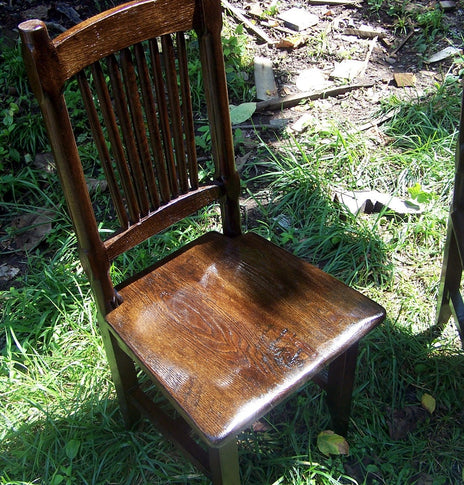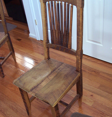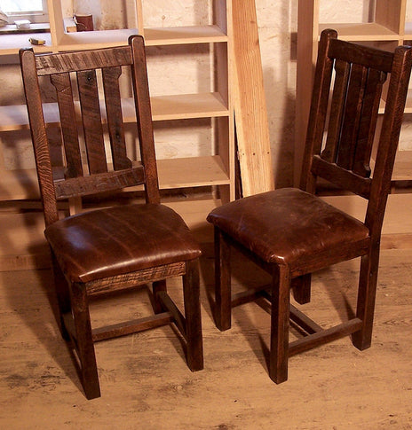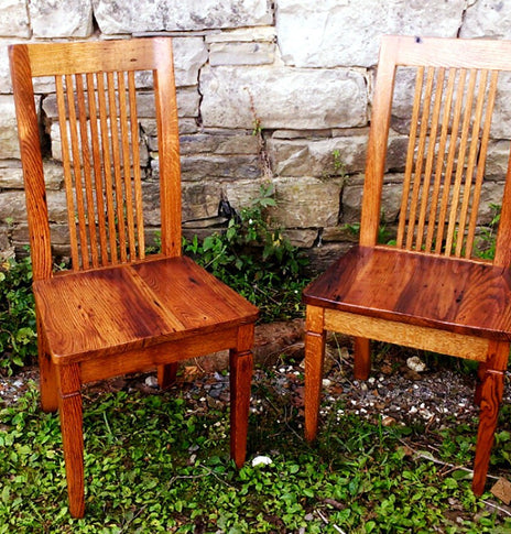 Handcrafted from solid oak, these chairs are a lovely rustic touch to any dining room. Featured here with a dark stain and traditional oil urethane finish. We also have wormy chestnut, pine and tulip tree.